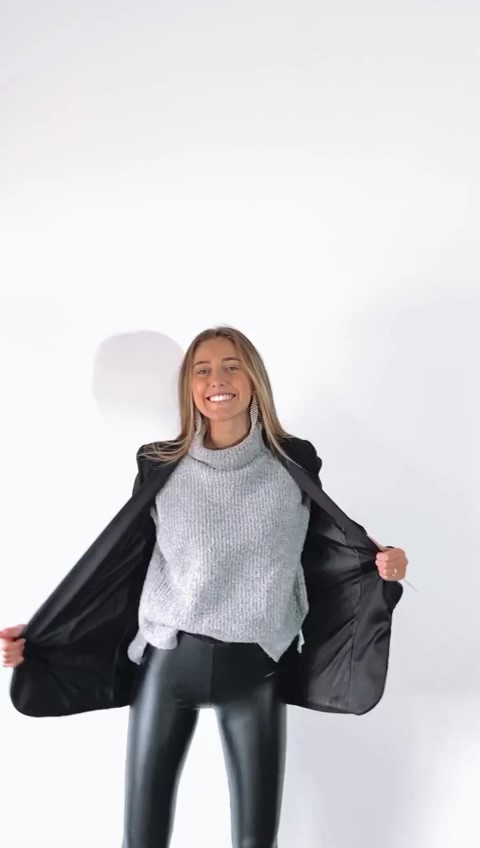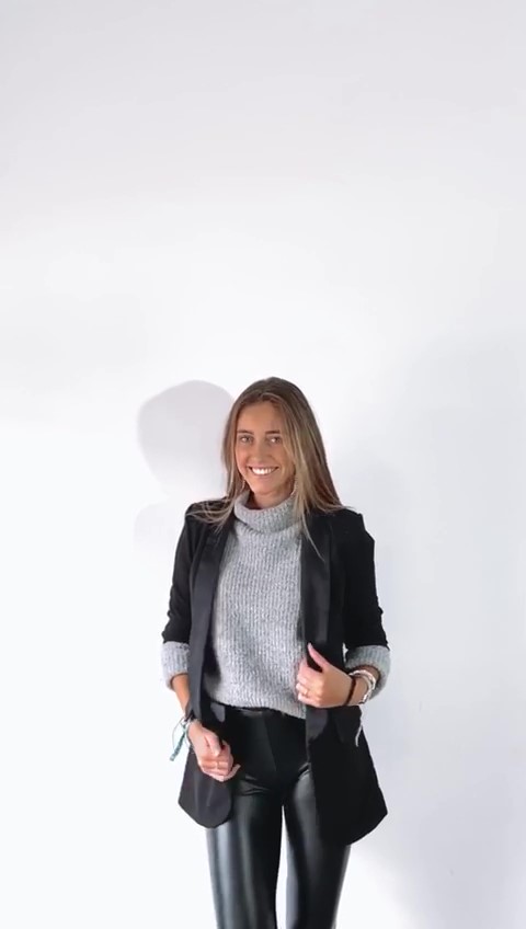 L’últim look que us portem avui és l’ideal per sortir amb amics a sopar una nit d’hivern. Un pantaló negre efecte làtex combinat amb l’americana negra. Per trencar el total black recomanem combinar-ho amb un jersei de coll alt de color gris. Un outfit perfecte per dur durant les nits d’hivern.