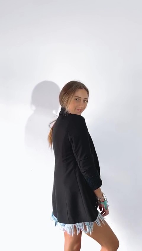 Combinem la blazer negra amb un jersei de coll alt del mateix color. En comptes de combinar-lo amb uns jeans, la millor opció és fer-ho amb una faldilla texana per trencar el look i donar-li un toc diferent.
